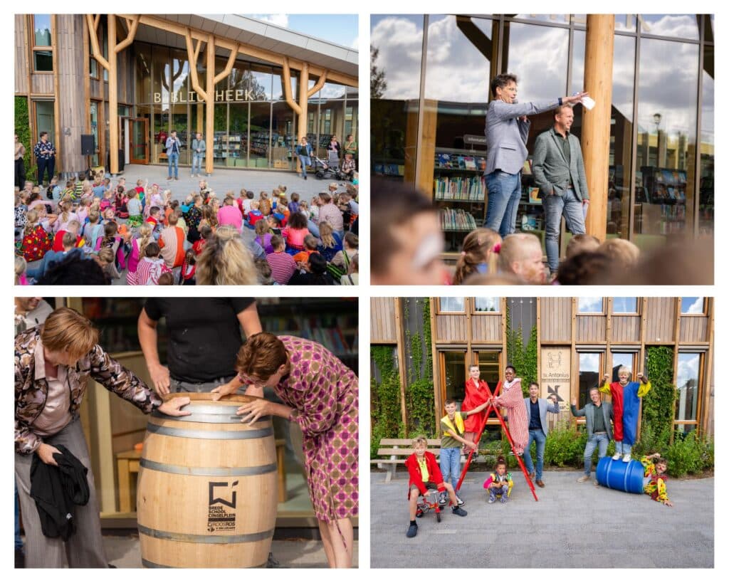De kinderen gaven een kleurrijke circusvoorstelling op het plein en wij verrasten de school samen met RoosRos Architecten met een regenton en gietertjes – zo kunnen de leerlingen zelf helpen bij het verzorgen van het groen.